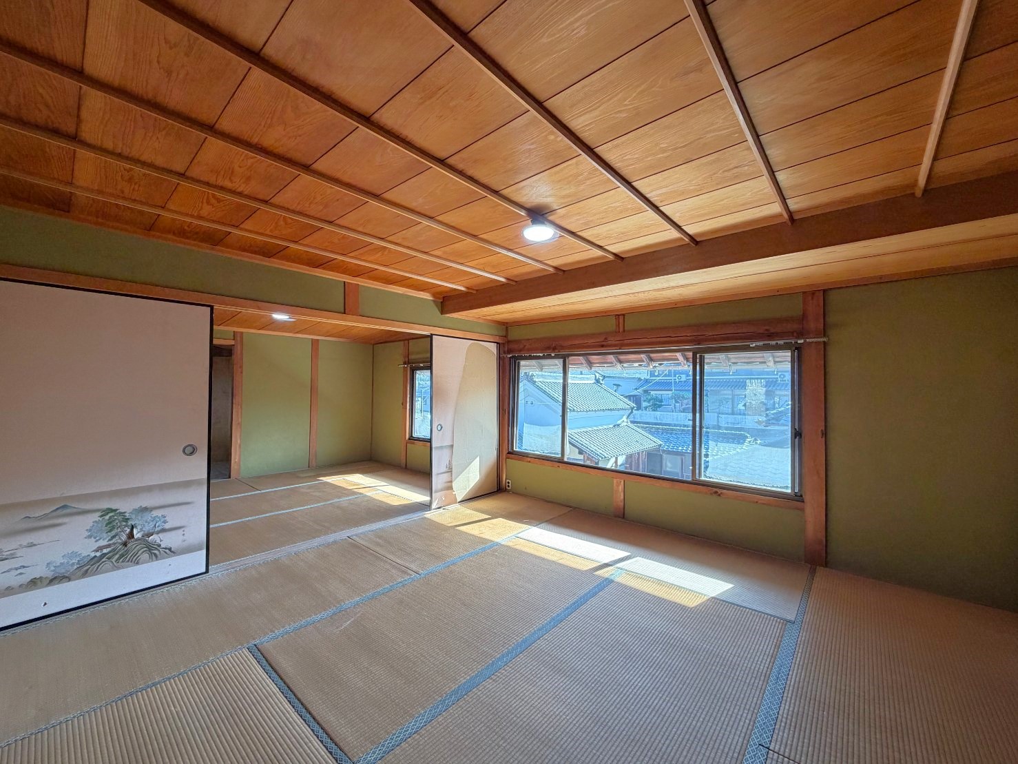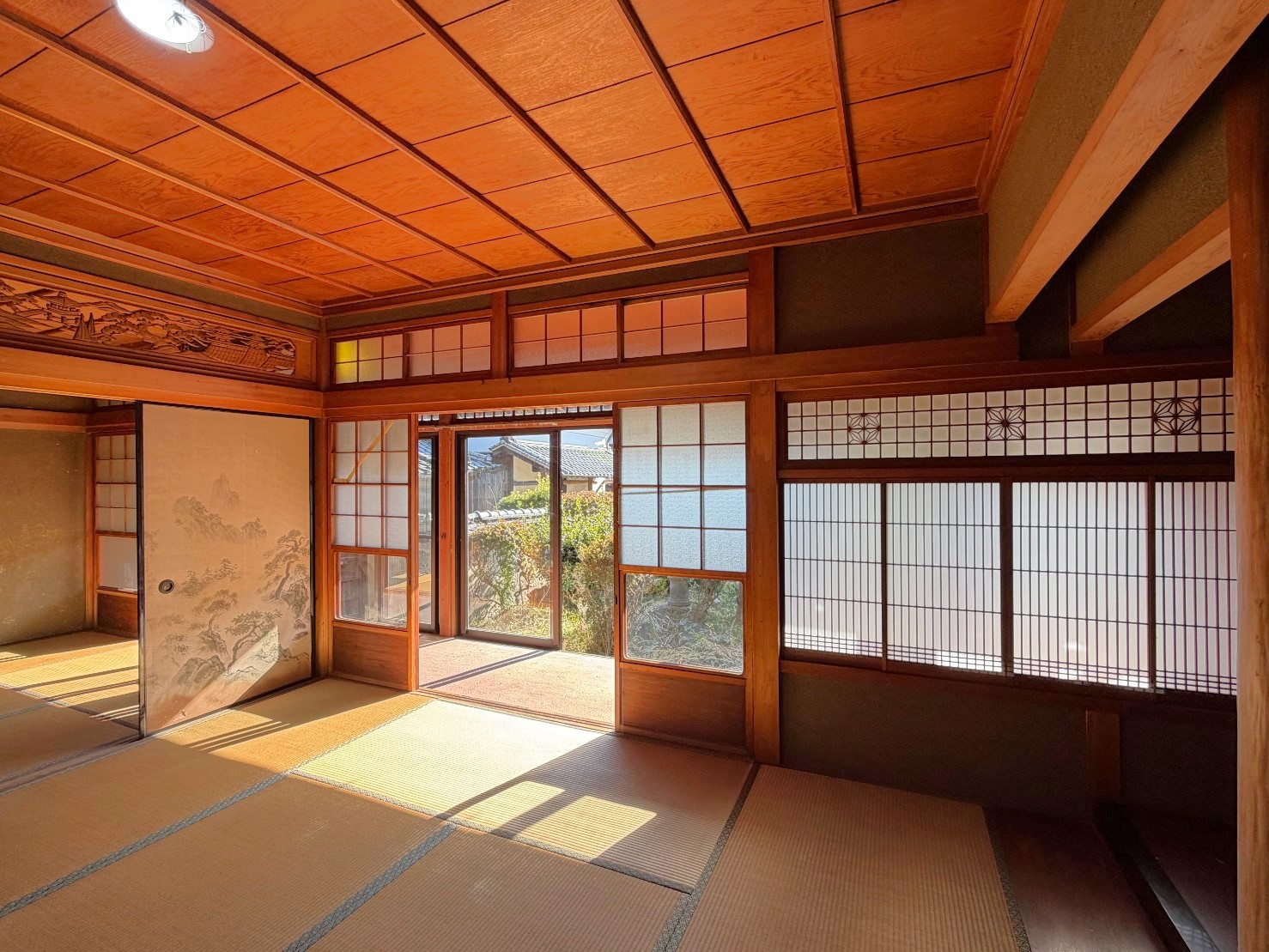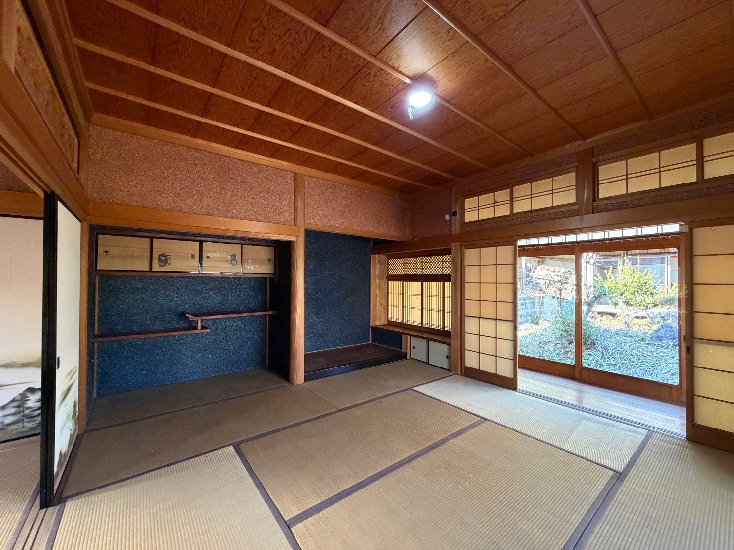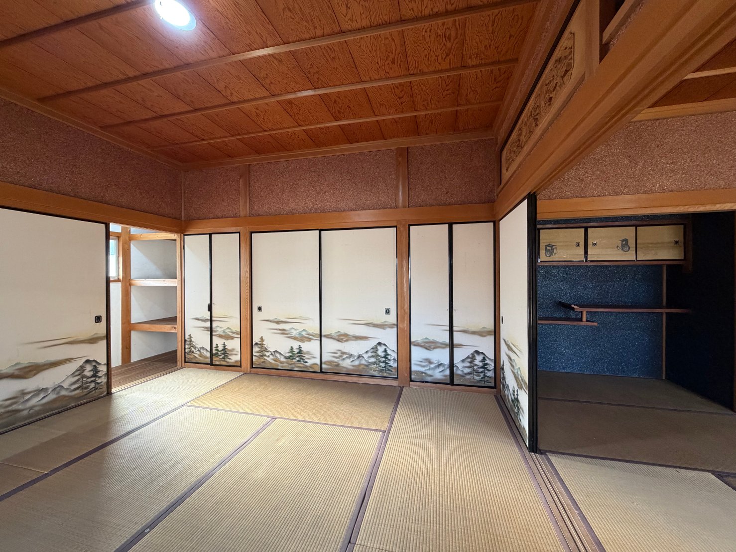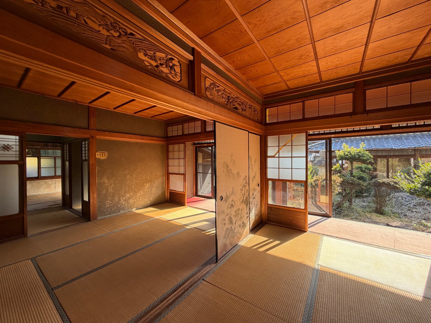 Kanmaki Town sits on expansive hills in the northwestern Nara Basin, an area rich in history with numerous ancient burial mounds reflecting its role in early Japan. While much of the hills has developed into a bedroom community for the Osaka metropolitan area, tranquil scenery of bamboo groves, woodlands, rice fields, and ponds still remains. This impressive kominka with a stately gate stands on a generous plot at the edge of an old village. Traditional buildings arranged around an inner courtyard create an elegant atmosphere. A short walk leads to a newer residential area with shops and daily amenities, allowing residents to enjoy both suburban calm and urban convenience. Nara and central Osaka are just over 30 minutes by car, and Kansai International Airport is under an hour away.