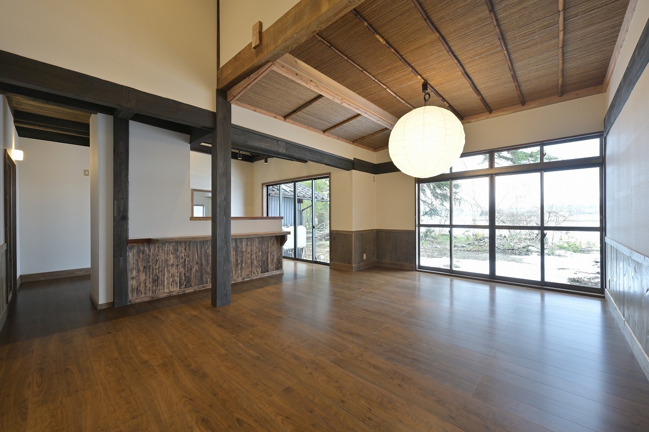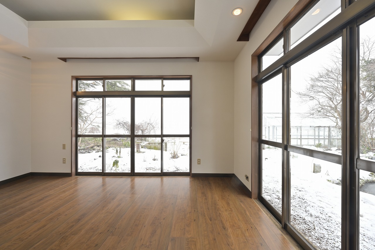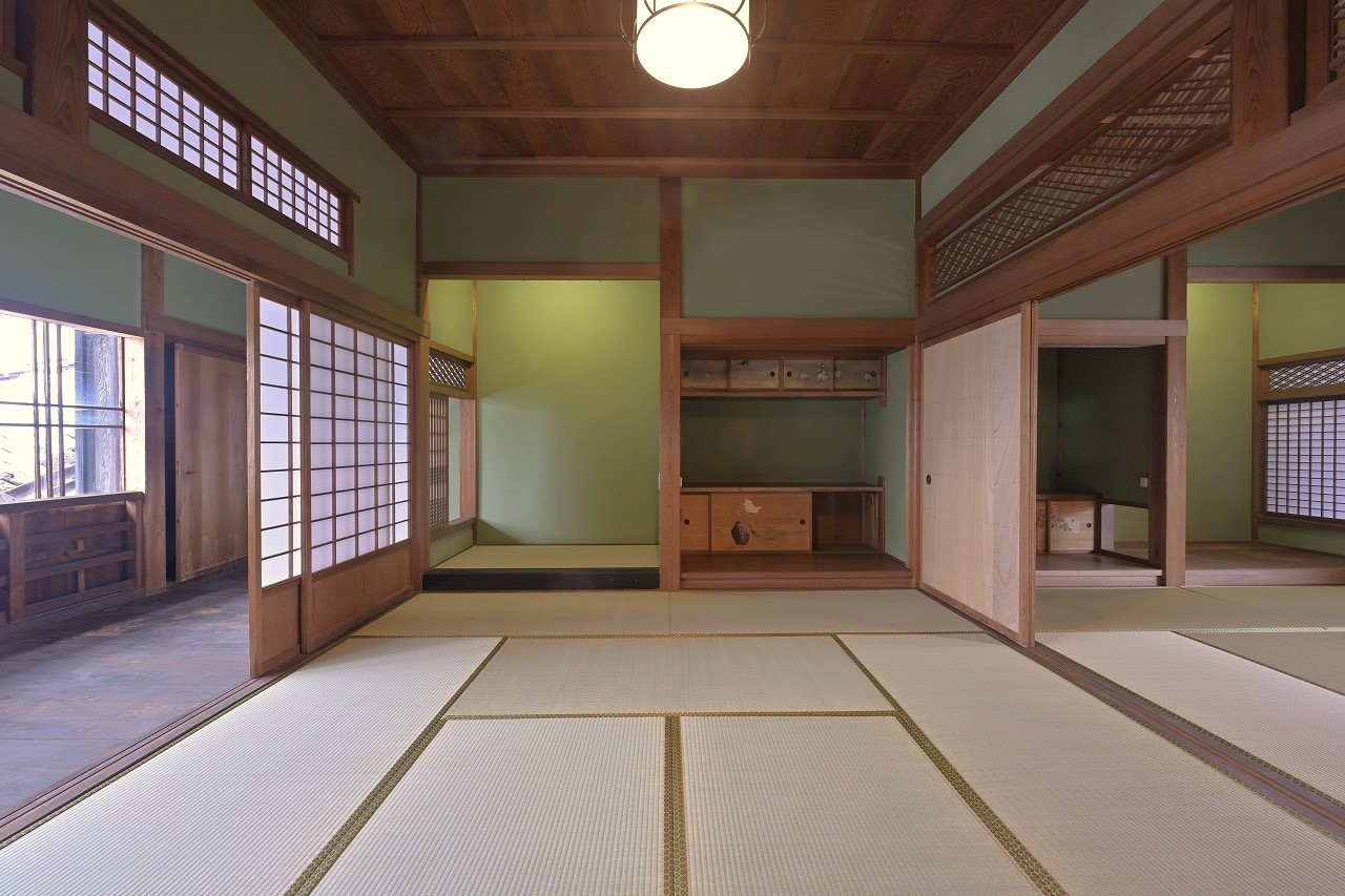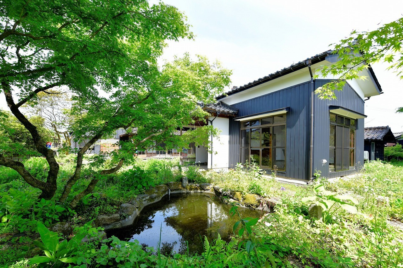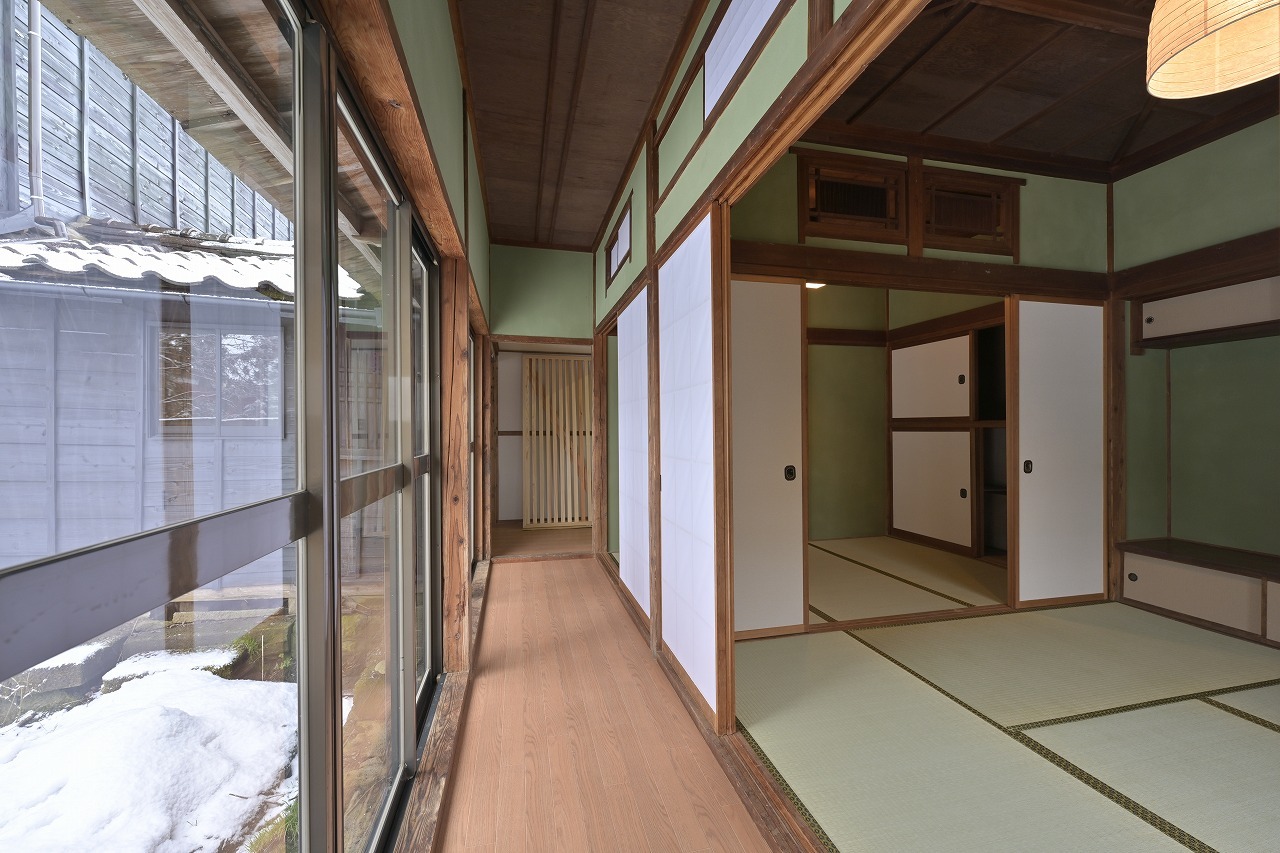 Sanjo City, in central Niigata Prefecture, is a leading metal processing hub alongside neighboring Tsubame City, with suburbs known for fertile fields and delicious local produce. This fully renovated Kominka, including the main house, detached structures, and Kura storehouses, sits at the edge of the Tsuruda settlement, offering a serene yet convenient setting. The property includes multiple Kura and a reservoir, suggesting it may have belonged to a prominent local family. Buildings are spread across a large plot and connected by covered walkways, allowing easy movement in any weather, while the Kura are enclosed by separate walls for preservation. One storehouse has been transformed into a spacious Western-style room with high ceilings, ideal for a dance or music studio thanks to its thick walls. The property is close to Sanjo city center and just 40 minutes from Niigata Shinkansen Station.