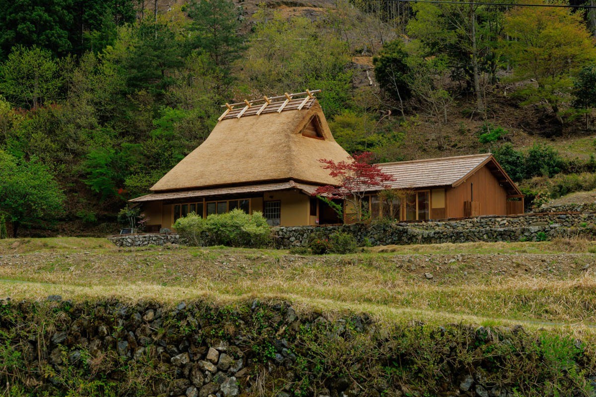 Located about an hour and a half northwest of central Kyoto, this impressive thatched farmhouse with a traditional irimoya roof sits quietly in the mountains of western Miyama. With ample distance from neighboring homes and a satoyama landscape as its backdrop, it embodies the classic image of rural Japan. Unlike the busy tourist area of “Miyama Kayabuki no Sato,” this property lies farther up a valley along a tributary of the Yura River, offering a peaceful setting with little tourist activity.