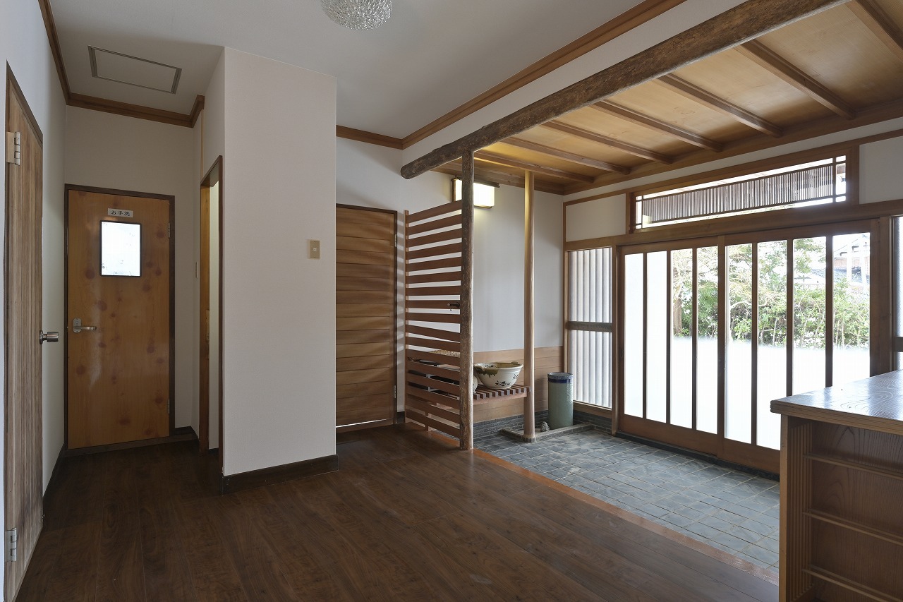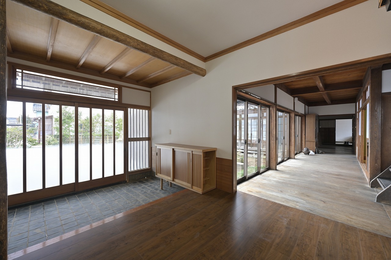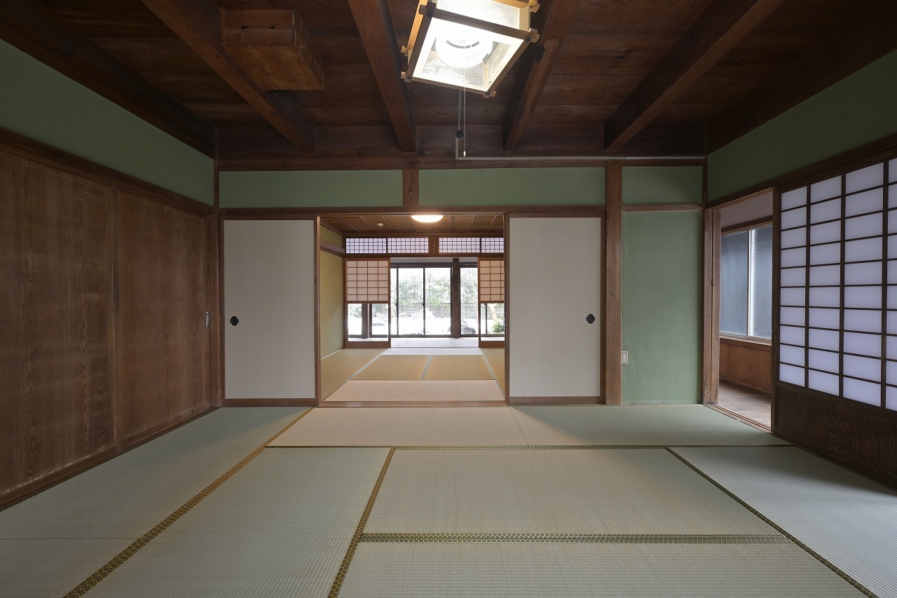 Sanjo City, in central Niigata Prefecture, is a leading metal processing hub alongside neighboring Tsubame City, with suburbs known for fertile fields and delicious local produce. This fully renovated Kominka, including the main house, detached structures, and Kura storehouses, sits at the edge of the Tsuruda settlement, offering a serene yet convenient setting. The property includes multiple Kura and a reservoir, suggesting it may have belonged to a prominent local family. Buildings are spread across a large plot and connected by covered walkways, allowing easy movement in any weather, while the Kura are enclosed by separate walls for preservation. One storehouse has been transformed into a spacious Western-style room with high ceilings, ideal for a dance or music studio thanks to its thick walls. The property is close to Sanjo city center and just 40 minutes from Niigata Shinkansen Station.